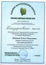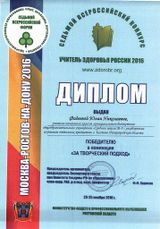 23-25 ноября 2016 года в Ростове-на Дону состоялся VII Всероссийский форум «Здоровьесберегающее образование». В рамках Форума состоялся финал VII Всероссийского конкурса «Учитель здоровья России — 2016». В финале конкурса приняли участие 34 учителя из разных субъектов РФ. Нижегородскую область на данном конкурсе представляла Фадеева Юлия Николаевна, учитель начальных классов Муниципального бюджетного общеобразовательного учреждения «Средняя школа №8 с углубленным изучением отдельных предметов» г. Кстово. По итогам конкурса Юлия Николаевна стала победителем в номинации «За творческий подход». Она была награждена дипломом победителя в номинации и благодарственным письмом Общероссийской общественной организации содействия укреплению здоровья в системе образования. Поздравляем Фадееву Юлию Николаевну с достойным выступлением в финале.